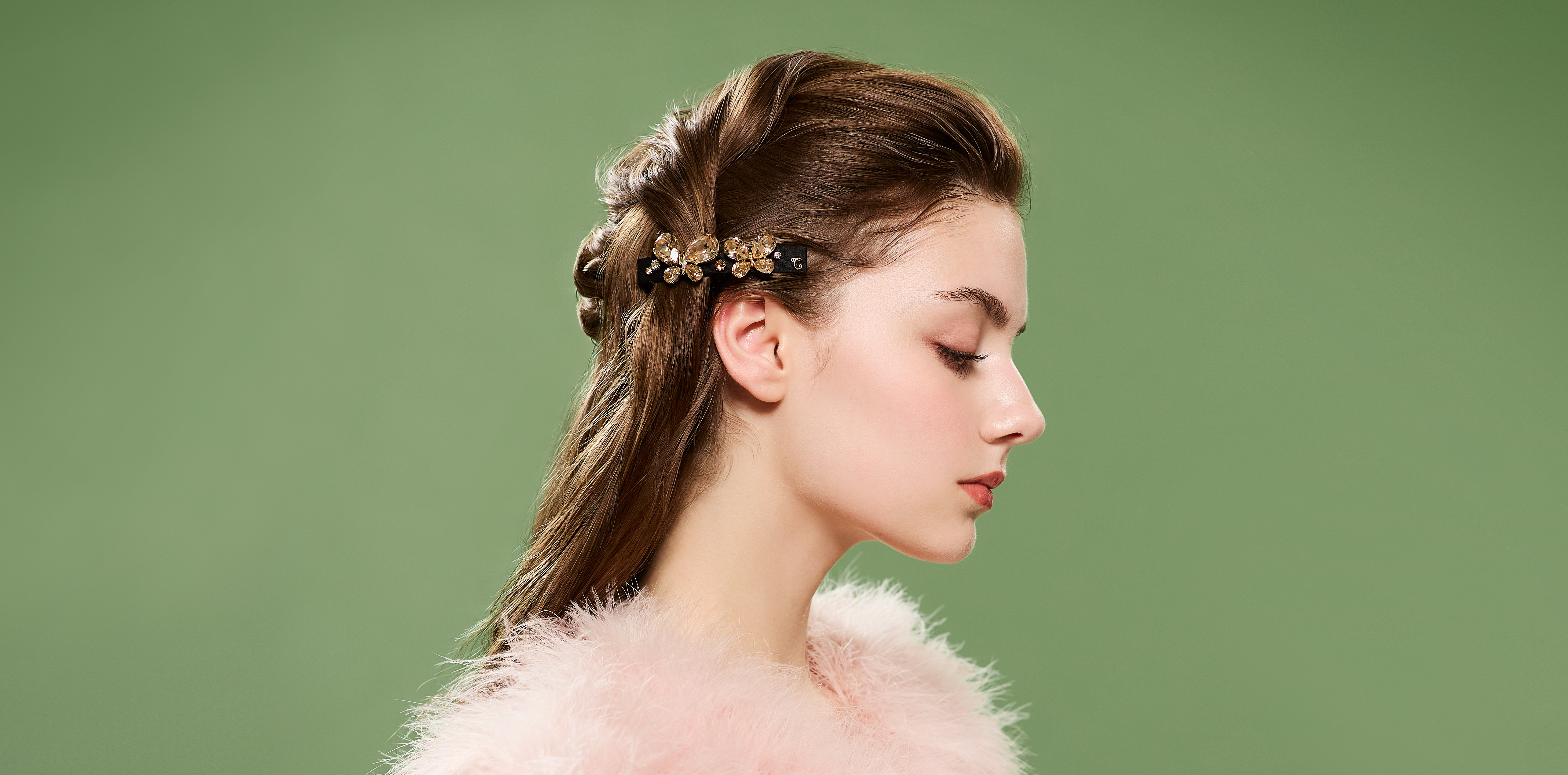 カラーコンビネーションの美しさと、存在感のあるストーンが華やかに映えるポニー。スワロフスキー®・クリスタルが万華鏡のようにきらめく優雅なポニーは、いつものまとめ髪に華やかさを添えます。
